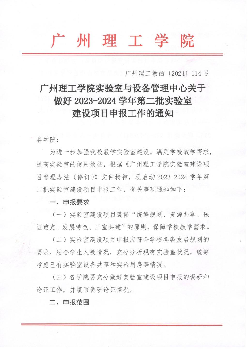 广州理工教函〔2024〕114号 广州理工学院实验室与设备管理中心关于做好2023-2024学年第二批实验室建设项目申报工作的通知.pdf