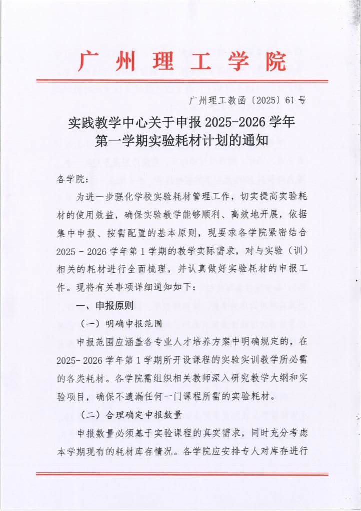 广州理工教函〔2025〕61号 实践教学中心关于申报2025-2026学年第一学期实验耗材计划的通知