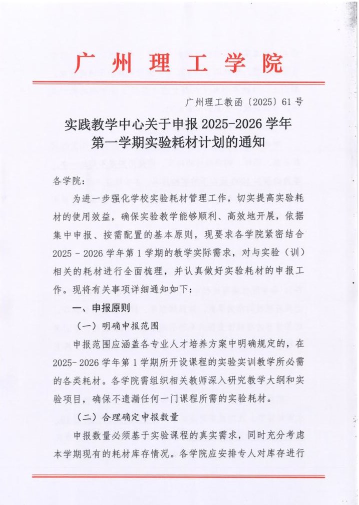 广州理工教函〔2025〕61号 实践教学中心关于申报2025-2026学年第一学期实验耗材计划的通知.pdf
