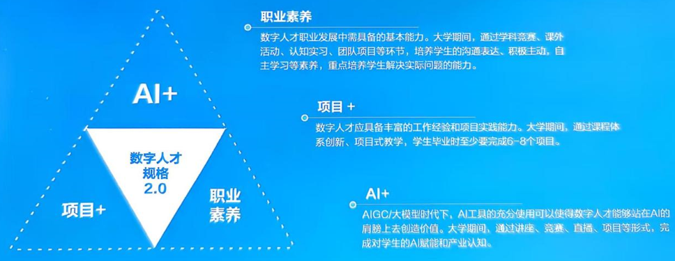 通过数字人才规格,建立复合型产业人才的培养标准和达成路径,保障学生在未来职业发展中能飞的更高更远。精准培育具备“AI+”能力的、职业素养高的、项目实践能力突出的、满足产业综合需求的应用型人才。